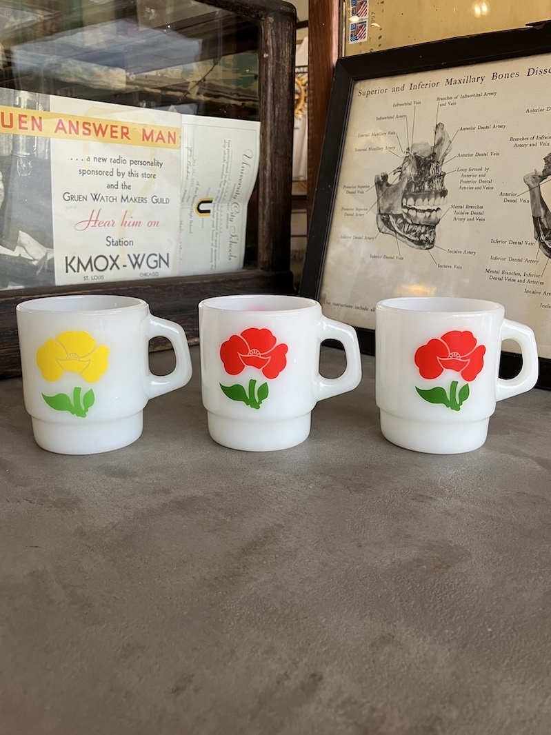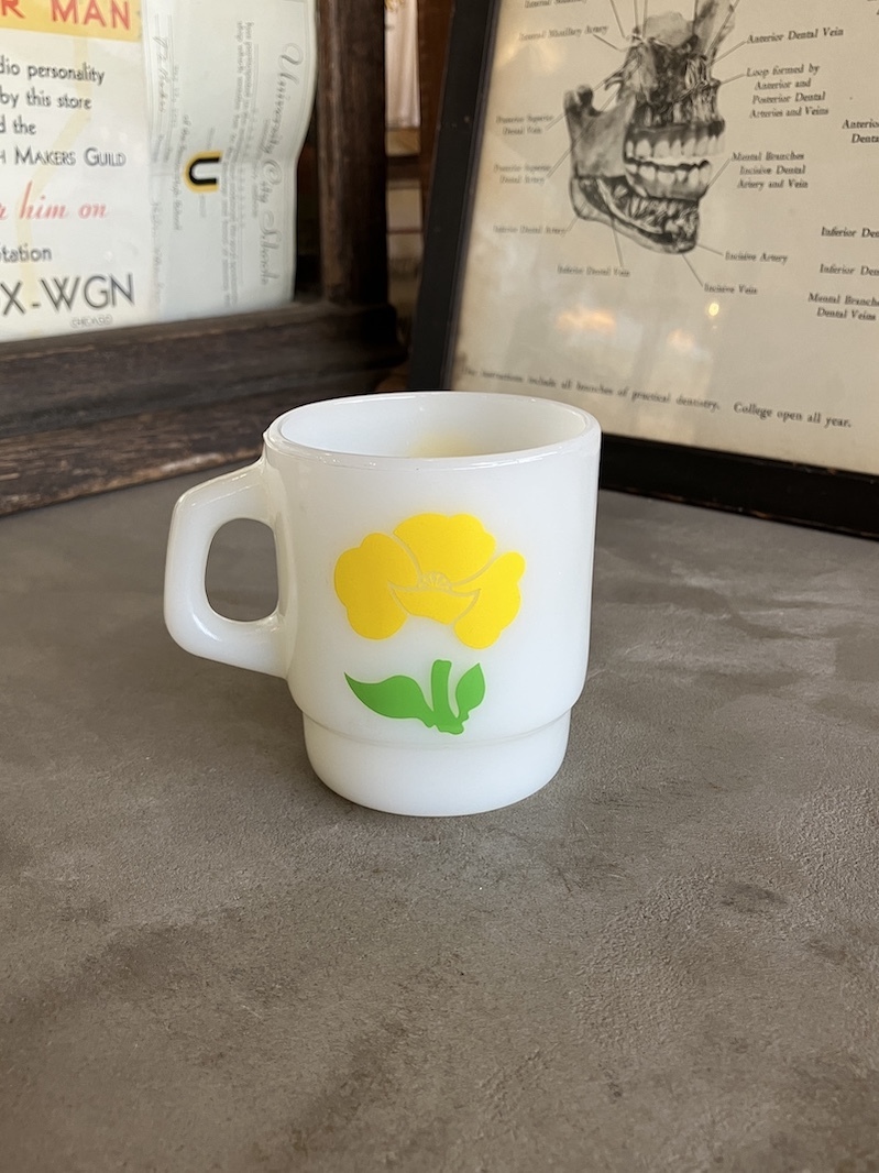 - > 1960'S 70'S Fire-King スタッキングマグ FOXY FLOWERS フォクシーフラワーズ ポピー アンカーホッキング ファイヤーキング レッド&イエロー ミントコンディション アンティーク ビンテージ